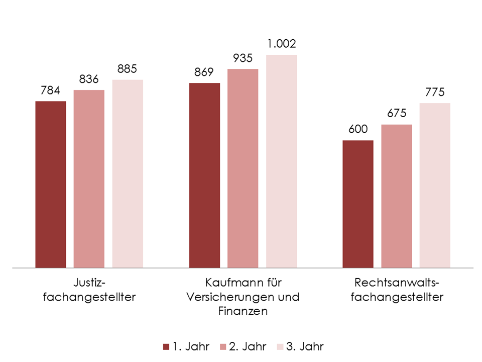 Eine Ausbildung zum Justizfachangestellten dauert 3 Jahre und wird durchschnittlich hoch vergütet. Im ersten Jahr Deiner Ausbildung erhältst Du ein monatliches Gehalt von 784 Euro. Mit Beginn des zweiten Jahres erhöht sich diese Summe auf 836 Euro. Während Deines letzten Jahres kannst Du mit einem Verdienst von 885 Euro pro Monat rechnen. Nach dem Abschluss Deiner Ausbildung und mit dem Start Deiner Karriere verdienst Du deutlich mehr. Rechne je nach Arbeitgeber und Deiner Berufserfahrung mit 2.000 bis 3.000 Euro.