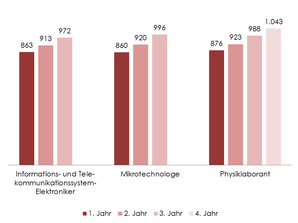 Mikrotechnologen absolvieren vor dem Einstieg ins richtige Berufsleben eine 3-jährige Ausbildung. Strebst Du eine Karriere in diesem Beruf an, liegt Deine Ausbildungsvergütung mit monatlich 860 Euro im ersten, 920 Euro im zweiten und 996 Euro im letzten Jahr genau im Durchschnitt. Nachdem Du Deine Ausbildung erfolgreich abgeschlossen hast, kannst Du im Beruf mit einem Gehalt von 2.000 bis 3.000 Euro rechnen. Diese Summe hängt natürlich von Deiner Erfahrung und Deiner zukünftigen Anstellung ab.